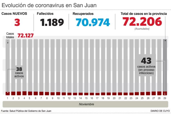 San Juan acumuló ayer otra jornada sin personas fallecidas por covid, a la vez que fueron reportados tres nuevos casos. Según el parte del Ministerio de Salud Pública, ayer fueron detectados tres positivos luego de procesar 103 test, por lo tanto el porcentaje de positividad fue bastante bajo. Ahora bien, con estos contagios, el total de sanjuaninos infectados a lo largo de la pandemia es de 72.206.