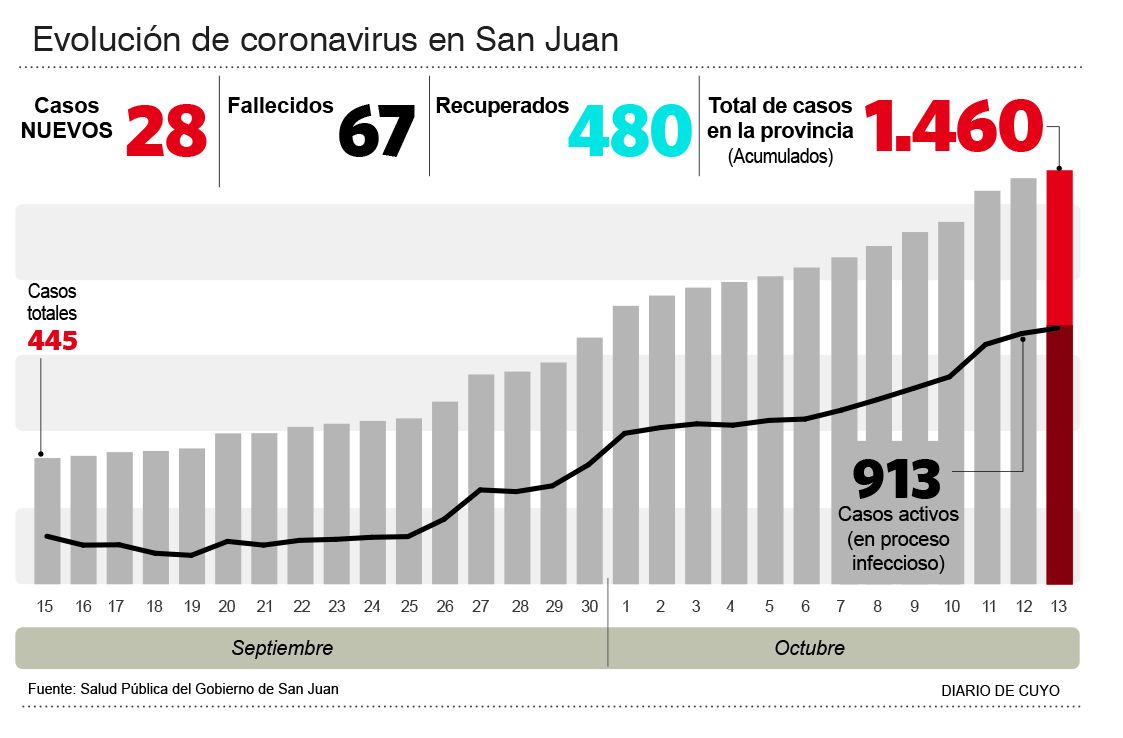 Exactamente a 50 días desde el primer deceso por coronavirus en la provincia, tres muertes más de sanjuaninos fueron reportadas ayer, para totalizar 67 en ese periodo. Así, en promedio, en San Juan mueren poco más de 13 personas cada 10 días, una cifra escalofriante que por ahora no parece tener un amesetamiento en la curva, pues sigue en alza. Por otro lado, ayer fueron confirmados 28 nuevos casos de Covid-19, lo que genera un acumulado de 1.460.