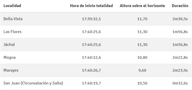 A continuación, los datos básicos de observación del eclipse solar para algunas localidades de la provincia. Es decir, la hora de inicio de la fase de totalidad, la duración del eclipse total y la altura del Sol en ese instante: