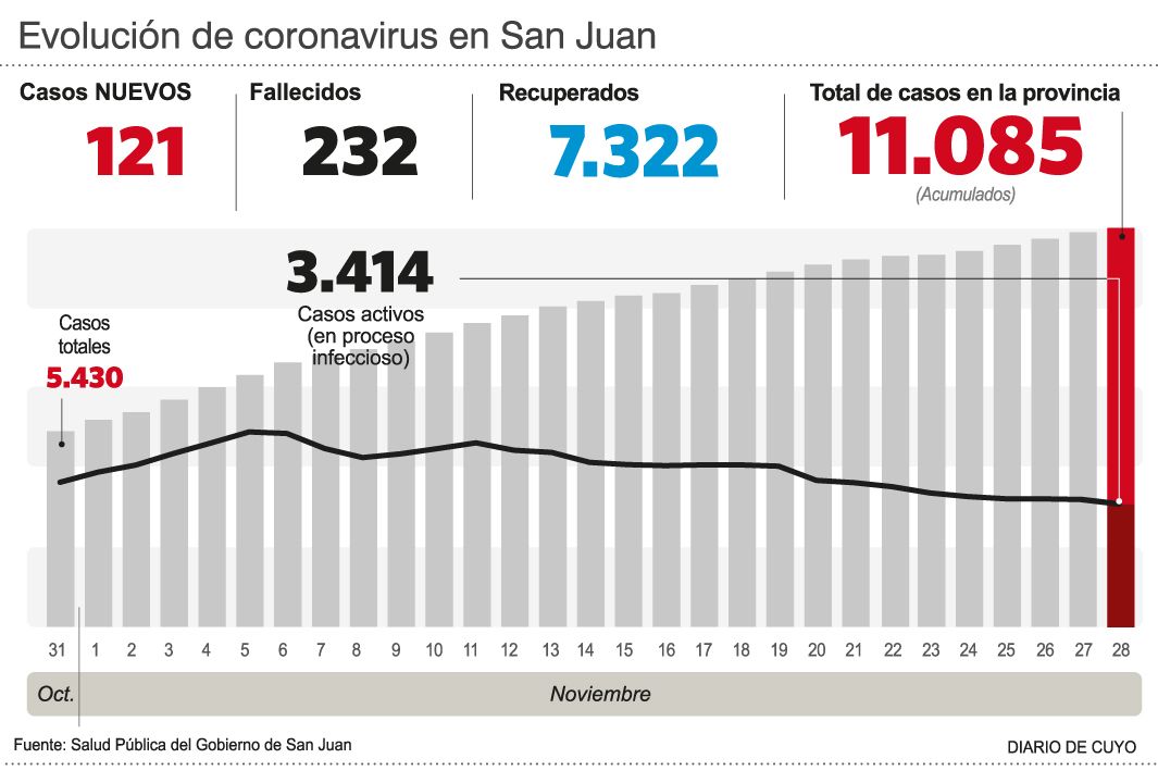 En el último mes, el comportamiento estadístico diario de las personas recuperadas de Covid ha sido variable, con picos de 12 y 630 personas por día. Pero el crecimiento ha sido sostenido al punto que en este lapso la cantidad de sanjuaninos que superaron el coronavirus creció ocho veces, para totalizar ayer 7.322 de acuerdo al último parte de Salud Pública. Y es que hace un mes, los recuperados eran 890 y la curva fue subiendo a un promedio de poco más de 200 altas por día. Por otro lado, ayer fueron informados cuatro decesos y 121 nuevos casos, por lo que San Juan superó la barrera de los 11.000 contagios.