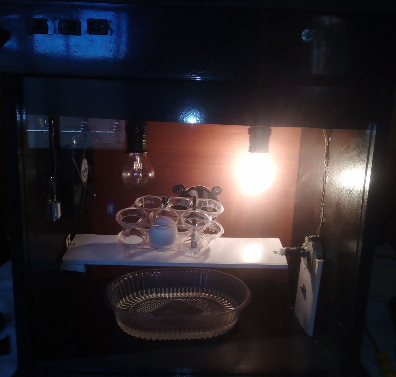Además, hay que colocar un recipiente con agua (que debe limpiarse todos los días para evitar cualquier tipo de bacterias) en la plataforma debajo de los huevos para que éstos tengan humedad a través del calor que brindan los focos encendidos. En los primeros días se necesitará un 60 o 70% de humedad, mientras que en el final del período será obligatorio que haya un 80% de humedad, porque a medida que el embrión se va incubando, el huevo va perdiendo agua.