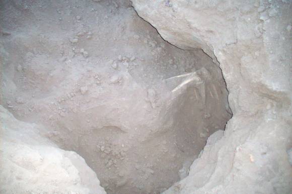 Según trascendió de fuentes vinculadas al hallazgo, una familia se encontraba paseando por el camino viejo de Villa Corral, al norte de Calingasta, durante el feriado del Viernes Santo pasado. Los niños jugaban cerca de la ruta, cuando la nena se metió en un pozo de alrededor de medio metro de profundidad y, a los gritos y espantada, llamó a su padre para que viera lo que había allí: el contorno de un cuerpo humano tapado por la tierra, con parte de los huesos de las piernas y de las rodillas al aire, y también con una parte del cráneo bastante visible.