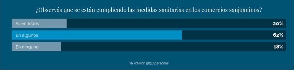 De un sondeo del que participaron 5.938 votantes, el 62% aseguró que sólo "en algunos" comercios sanjuaninos se está cumpliendo la normativa sanitaria, mientras que el 20% se inclinó por la opción de "sí, en todos" se lleva adelante el protocolo. Por último, el 18% restante sostuvo que "en ningún" local, sea del rubro que sea, se llevan adelante las disposiciones para hacerle frente al Covid-19.