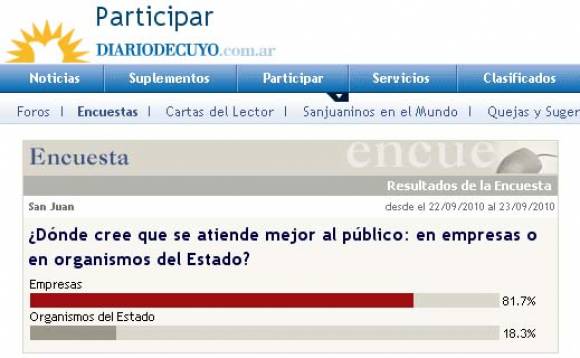 El resultado de la encuesta realizada, en la que se preguntaba: “Dónde cree que se atiende mejor al público, en empresas o en organismos del estado”, fue contundente. El 81.7 % de los lectores que participaron se inclinaron por una mejor atención del sector privado, mientras que sólo el 18.3 % sostuvo que se lo atiende mejor en el ámbito público o estatal.