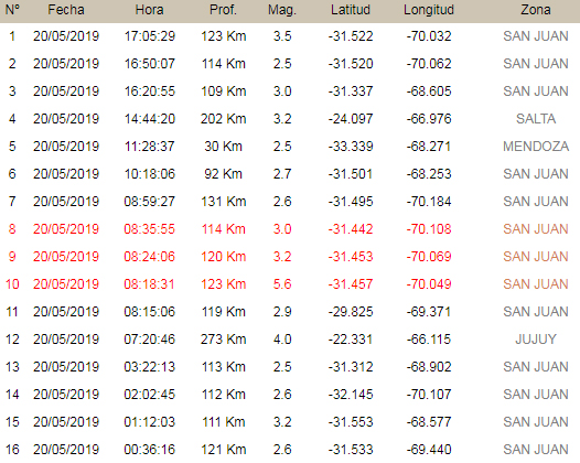 Entre las 00:36 de este lunes y las 17:05, se registraron 13 sismos. El más fuerte fue el de las 8:18 que alcanzó una magnitud de 5,6° en la Escala de Richter, pero hubo dos más percibidos a las 8:24 (3,2°) y a las 8:35 (3,0°).