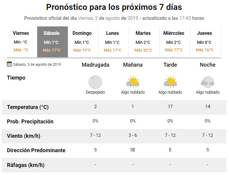 Una siesta agradable es la que se prevé para el sábado, según los datos del Servicio Meteorológico Nacional. Se espera que la máxima ascienda hasta los 17°C y la mínima caiga hasta 1°C.