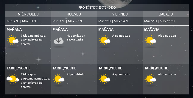 Según la página del Servicio Meteorológico Nacional, para este miércoles se espera que la temperatura alcance una máxima de 31ºC mientras que la mínima caerá hasta los 7ºC.