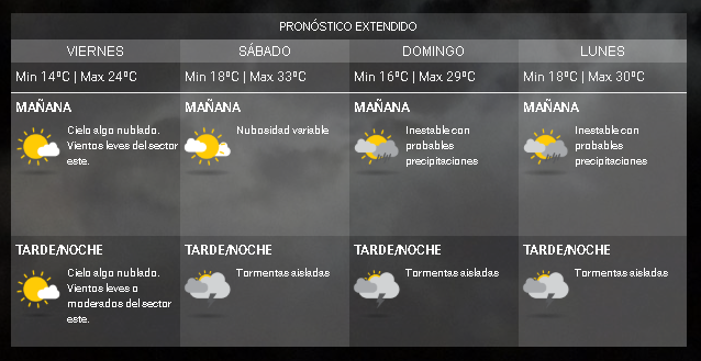Para el sábado, la temperatura subirá hasta los 33ºC mientras que el domingo marcará 29ºC. El lunes, la máxima será de 30ºC. Se prevé que esté inestable con probables precipitaciones.