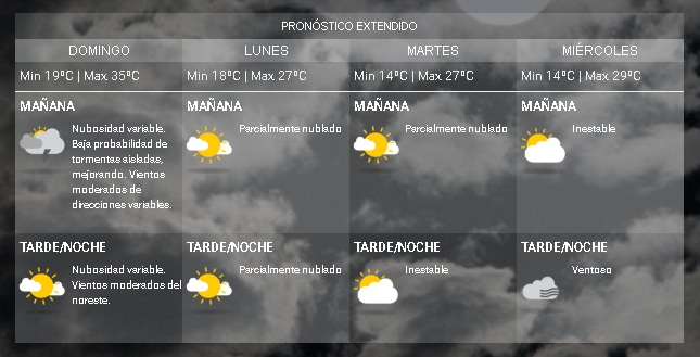 El fin de semana se despide con temperaturas elevadas. Según el Servicio Meteorológico Nacional, para el domingo prevén que la máxima llegue hasta los 35ºC mientras que la mínima caerá hasta los 19ºC.