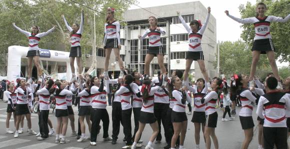 En el punto de llegada, establecido en la sede municipal, un equipo de cheerleaders (animadores deportivos) del Instituto E y M los esperaba con una exhibición que combinaba acrobacia y gimnasia artística. El cansancio de los corredores se convirtió en aplausos ante las destrezas de las jóvenes que trepaban a lo alto de pirámides humanas y se elevaban impulsadas por sus compañeros.