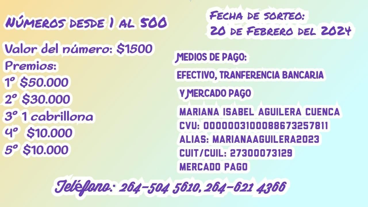 Para quienes quieran adquirir algún número, pueden abonar por Mercado Pago o transferencia bancaria (Alias: marianaaguilera2023) o comunicarse a los siguientes números: 2645045610 o 2646214366