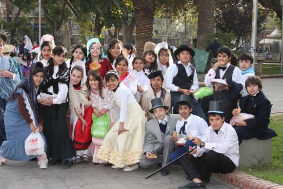 San Juan, 20 de mayo.- Durante la mañana de hoy, en la Plaza 25 de Mayo, unos 100 alumnos de la Escuela Superior Sarmiento, vestidos con trajes de época, entregaron escarapelas y bailaron para recordarle a la gente el significado de la Semana de Mayo.
