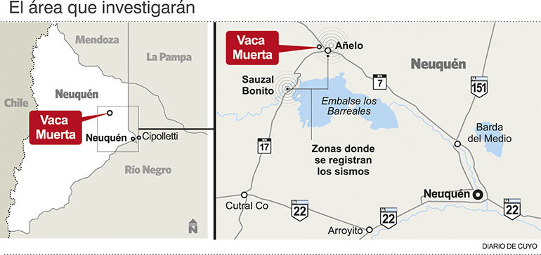 La investigación se producirá en el marco de un convenio que firmaron con el Gobierno de Neuquén y empresas petroleras congregadas en el Instituto Argentino del Petróleo y el Gas (IPAG), debido a una serie de sismos -mayores a los 3 grados- que comenzaron a percibirse con mayor frecuencia desde fines del año pasado en Añelo y Sauzal Bonito, dos localidades cercanas al yacimiento. El 16 de noviembre pasado, un sismo de 3,4 grados afectó a 8 viviendas de Sauzal Bonito. El estado de alerta de los habitantes fue creciendo a medida que otros temblores continuaron percibiéndose en la zona y "Vaca Muerta" pasó rápidamente a estar bajo la lupa. El método de explotación en el yacimiento es el conocido como "fracking" (se inyecta a presión algún material en el suelo, de modo que las fracturas que ya existen en las rocas del interior de la tierra aumenten y liberen el gas o el petróleo).