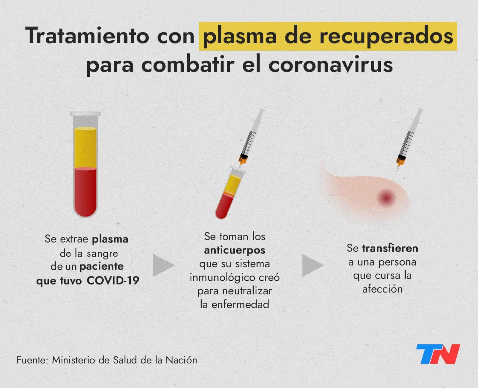 Según publicó TN.com.ar, la metodología comienza a ganar terreno en el país y según informó este martes el ministro de Salud bonaerense ya son 29 las personas a las que se les aplicó el tratamiento en la provincia de Buenos Aires. De hecho, desde la cartera se inició una campaña para recibir el plasma de todos los que hayan tenido coronavirus para ayudar a los que les cuesta superar la enfermedad.