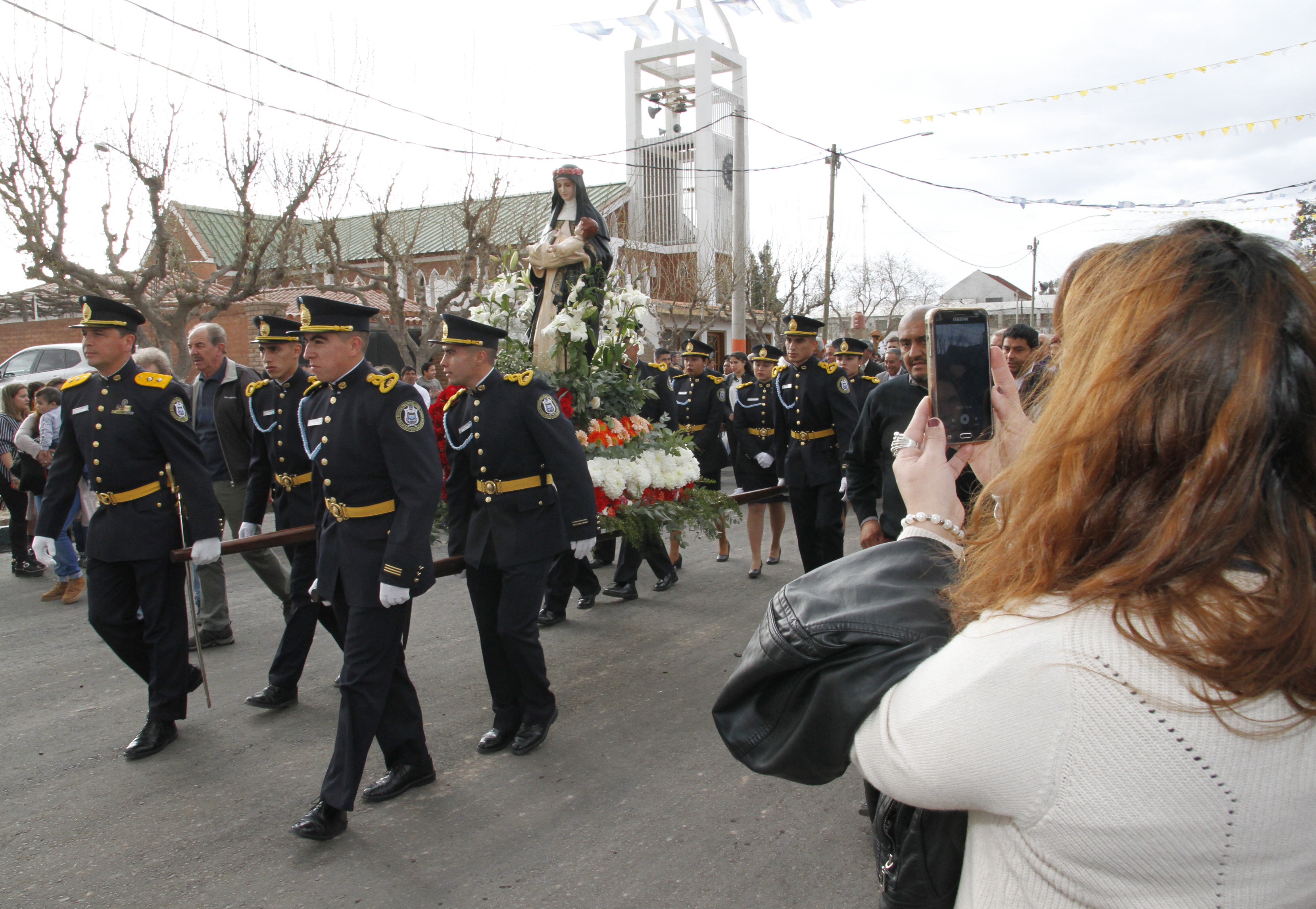 La bomba de estruendo anunció el inicio de la procesión. En ese mismo momento apareció Santa Rosa portada por 6 cadetes varones y custodiada por tres mujeres. Ellos encabezaron la caminata y realizaron la primera parte del recorrido portando la imagen. Fue hasta que los reemplazaron otros feligreses que también quisieron participar de esta tarea. Pero los uniformados no perdieron protagonismo. Caminaron rodeando a la Santa hasta el final de camino.