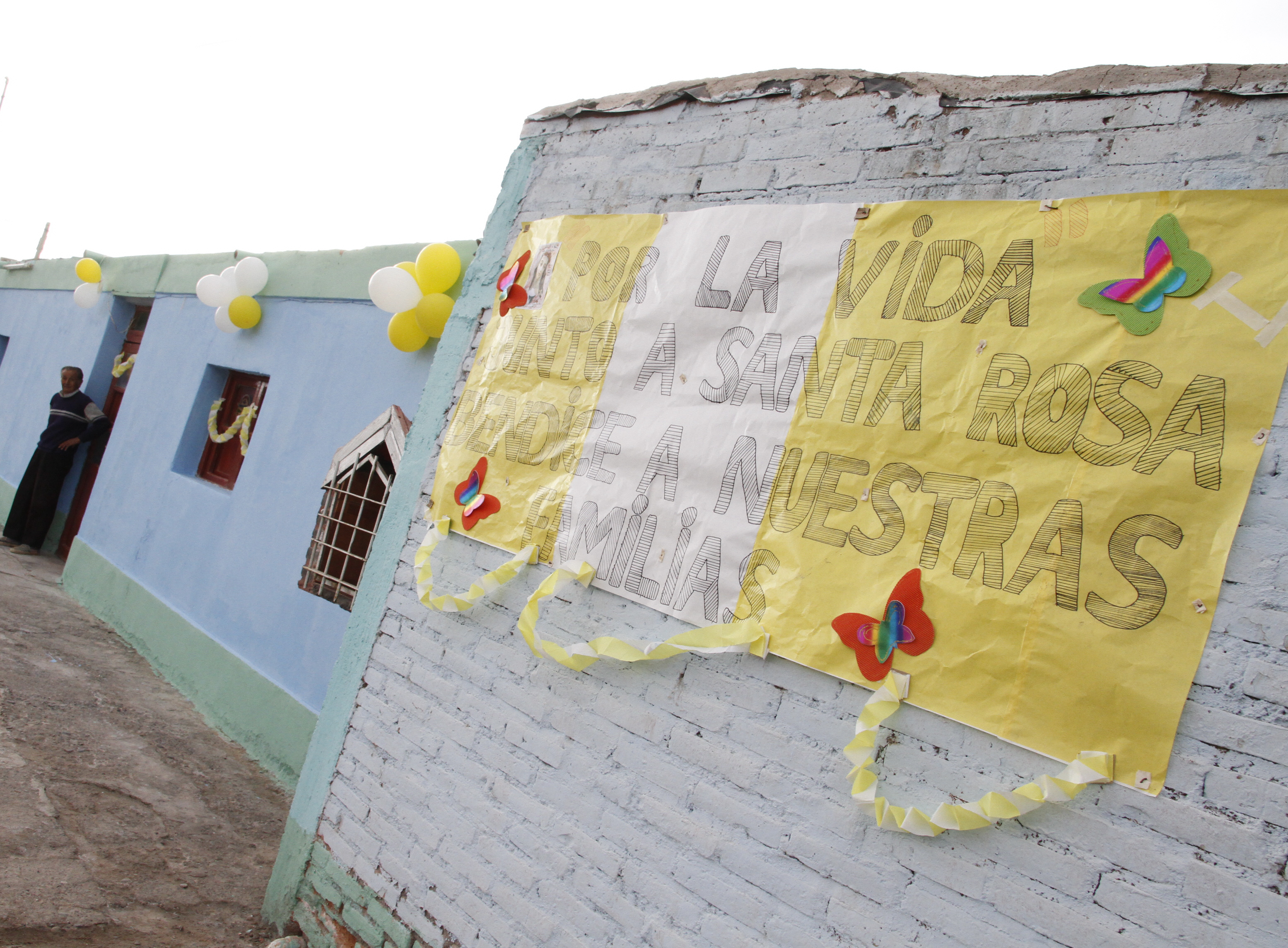 La mayoría de los vecinos de las inmediaciones de la Parroquia de Santa Rosa adornaron el frente de sus viviendas con globos blancos y amarillos y carteles en defensa de la vida.