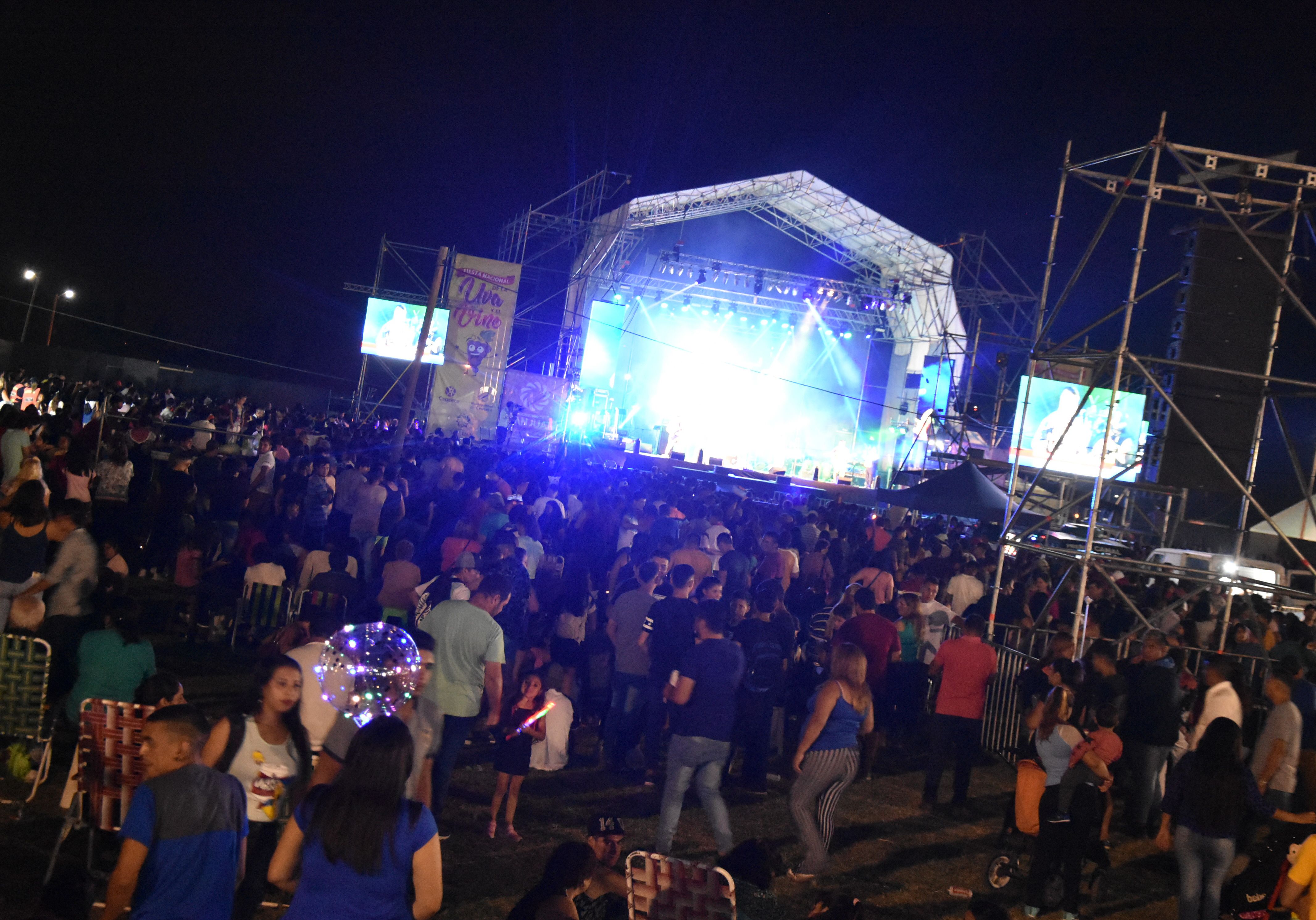 Multitudinario. La noche de apertura de la Fiesta de la Uva y el Vino contó con un público masivo. Unas 60.000 personas coparon el Predio Municipal de Caucete para disfrutar de este evento tradicional.