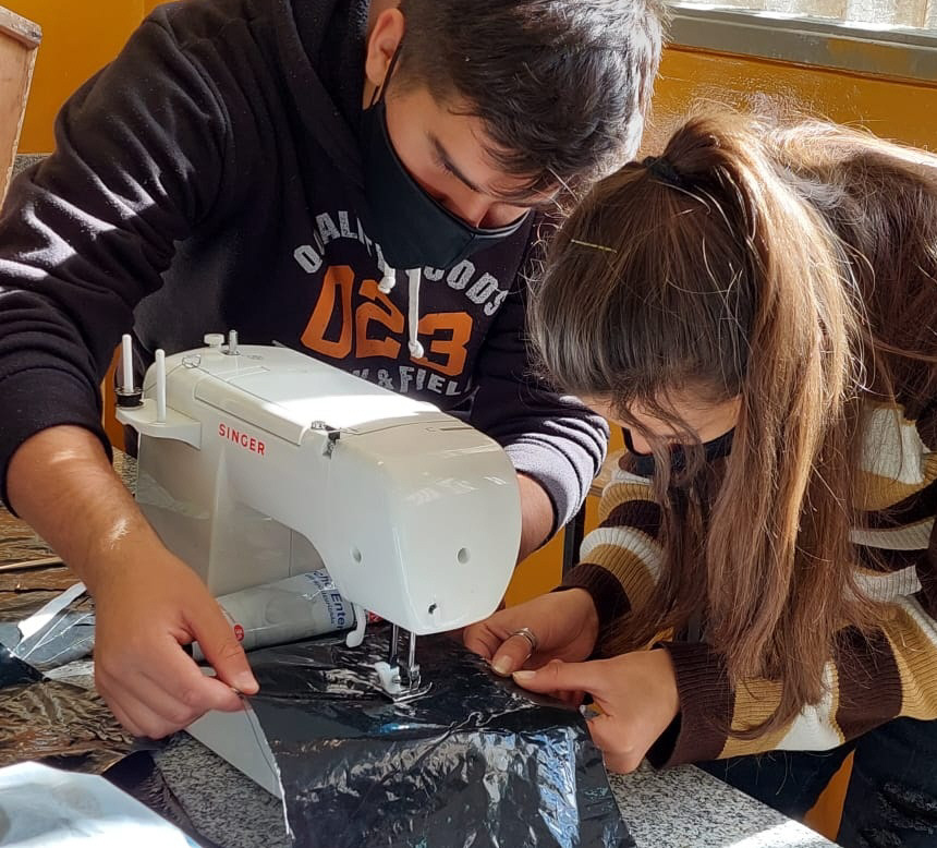 En la escuela EPET 2, de Capital, los alumnos de 6to años (34 chicos) son parte de la compañía IRU. Hacen bolsos materos con materiales reciclables. Este emprendimiento nació luego de que notaran que por la pandemia de coronavirus todas las personas salen de sus casas con su juego de mate para uso personal. Entonces pensaron en hacer estos bolsos, con sachets de leche o yogurt, entre otras cosas. Candela Orellano, una de las estudiantes dijo: "Utilizamos los sachets de leche vacíos como forro para que los bolsos sean impermeables".