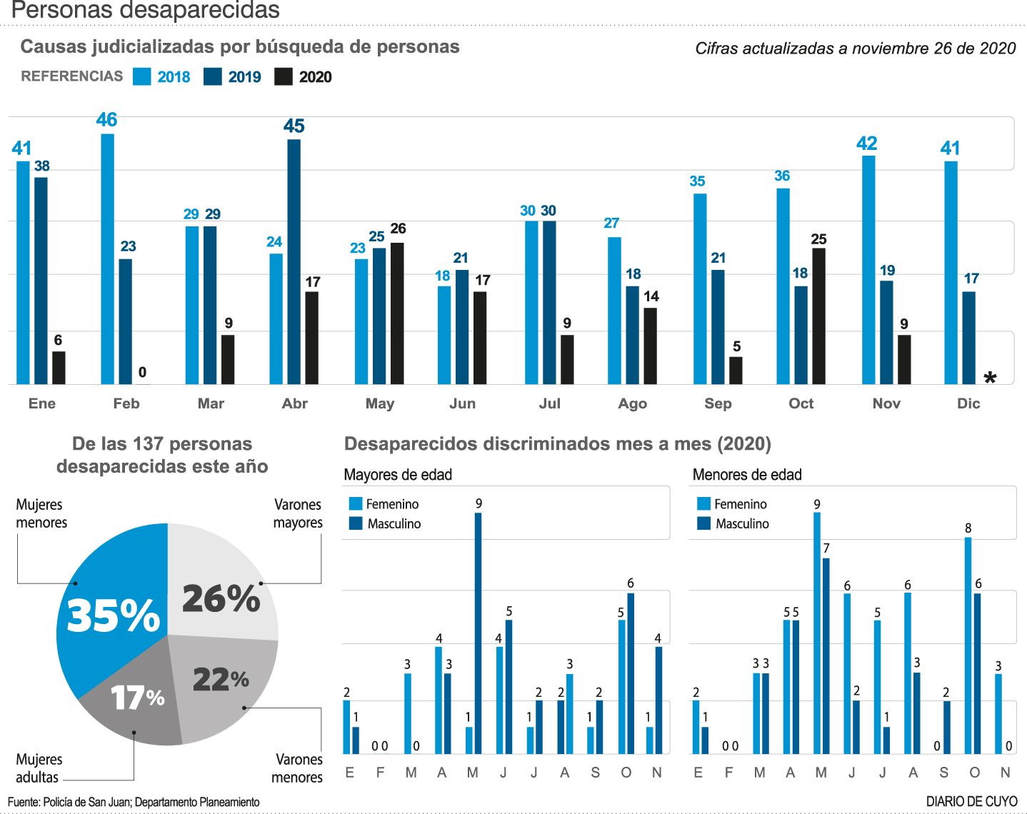 De enero a noviembre del 2019 hubo 287 causas judicializadas de búsqueda de personas. En el mismo período de este año, la cantidad fue de 137, es decir un 52% menos. Si bien la baja de casos es importante, desde la Policía dijeron que sigue siendo una problemática preocupante y atribuyeron parte del descenso a la pandemia. "Es positivo la disminución de casos, aunque sigue preocupando. Seguramente que la cuarentena fue una de las razones del descenso, aunque justamente por esta condición, pensamos que los casos iban a ser aun menos", dijo Raúl Ahumada, comisario del Departamento Planeamiento, dependencia de la Policía que maneja todos las estadísticas.
