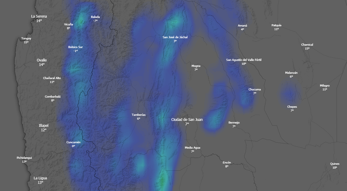 Hay otro sitio que le da respaldo a lo que indica el Servicio Meteorológico. En windy.com, que permite hacer seguimientos satelitales de diferentes variables meteorológicas, marca que caerá nieve pero no precisamente en el Gran San Juan.