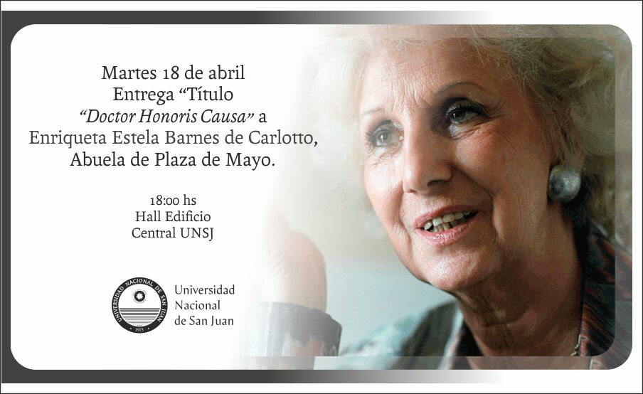 El Rector de la Universidad Nacional de San Juan, invita al Acto de entrega del ‘Título Honoris Causa’ que será entregado a una de las referentes de Derechos Humanos de nuestro país, Estela Barnes de Carlotto presidenta de la Asociación Abuelas de Plaza de Mayo.
