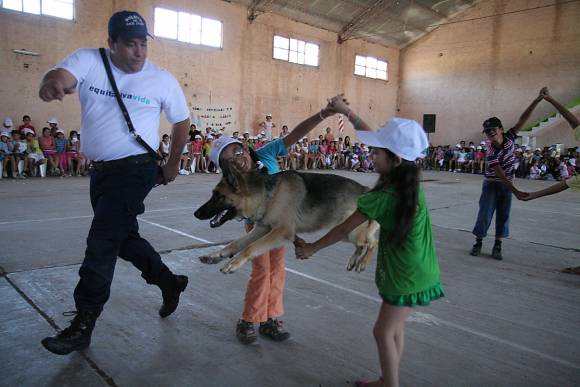 Primero fueron los silbidos de aliento pero, como eso alteraba un poco a los animales, los cambiaron por fuertes aplausos y suspiros de admiración. Con la mirada fija hacia el frente y más quietos que nunca, estaban unos 300 chicos sentados todos alrededor del gran galpón del polideportivo de Villa Santa Rosa, 25 de Mayo. Y la gran atracción estaba justo al centro: eran tres perros Ovejero Alemán, junto a sus compañeros humanos de la División Canes de la Policía, que, con sus demostraciones, se convirtieron en las estrellas de la mañana en la colonia de verano.