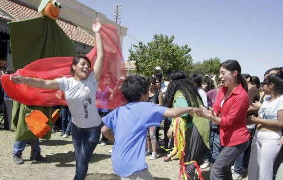 Haciendo malabares y levantando polvareda, los chicos participaron en la primera competencia de la jornada, una carrera con aros en la que compitieron 10 alumnos por cada escuela. Sin tiempo ni siquiera para tomar agua, se pusieron las camisetas para empezar los partidos de fútbol.