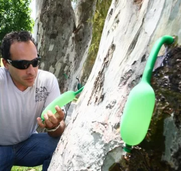 Ayer comenzaron a aplicar el tratamiento a los 5 eucaliptos del Centro Cívico que fueron atacados por un hongo que podría secarlos. En el tronco de cada árbol se hicieron 3 agujeros de 5 milímetros de diámetro donde se incrustaron ampollas de látex que contenían fungicida, enriquecido con fósforo y potasio, para que los árboles comiencen a recuperar su salud.