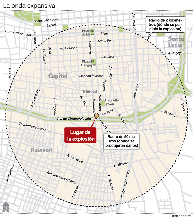 Tras la explosión que ocurrió el miércoles en el taller ‘ESI GNC‘, que dejó dos personas con quemaduras graves, la vida de los vecinos de la zona volvió a la normalidad parcialmente. En este contexto, tras realizar algunas pericias, el jefe de Bomberos de San Juan, Carlos Heredia, dijo que el radio de la onda expansiva fue de 50 metros y que en esa zona es donde se produjeron los daños. Hubo personas que dijeron que la explosión fue percibida hasta a 2 kilómetros del lugar del incendio. Algo que Bomberos corroboró. Incluso, algunos personas que tienen locales a más de media cuadra del taller dijeron que también sufrieron roturas en sus ventanas o vidrieras.