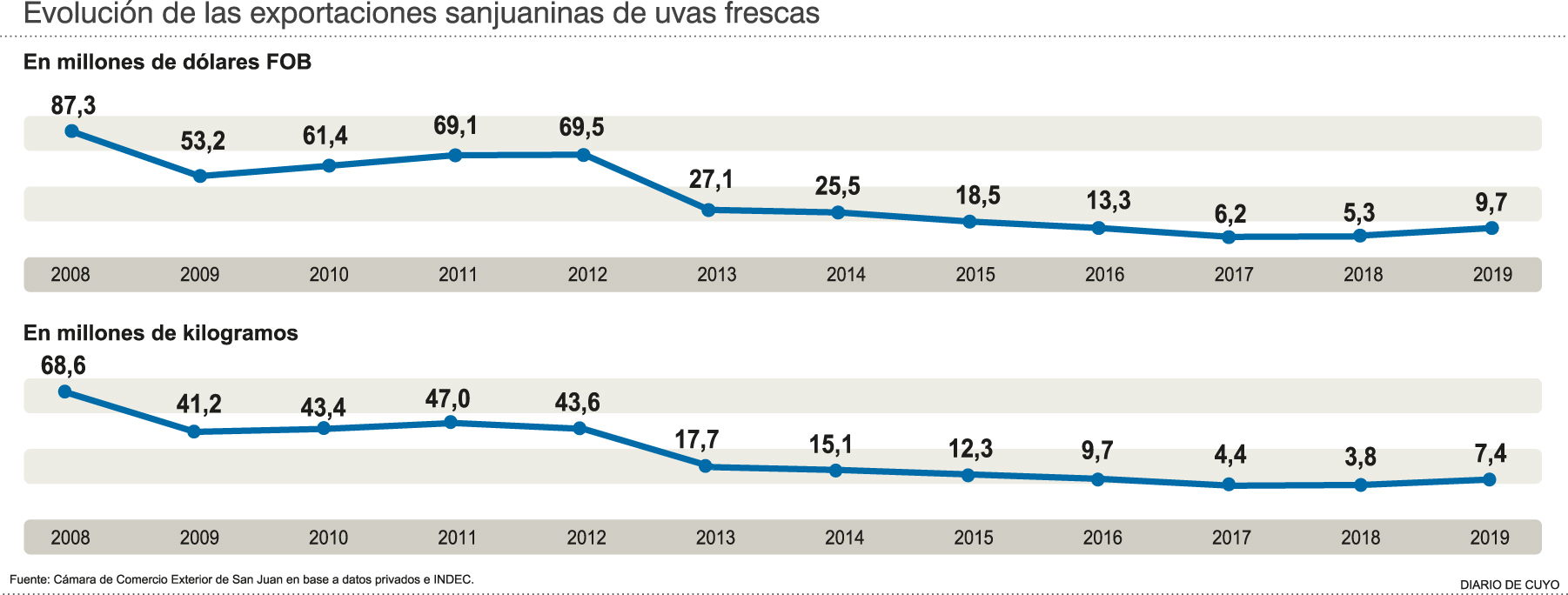 A poco más de 15 días del inicio de la temporada de cosecha de la uva en fresco, en el sector estiman que se podrán alcanzar los volúmenes del año pasado, cuando se enviaron al exterior unos 7,4 millones de kilos, una cifra casi un 80% por arriba de la del 2018, según datos de la Cámara de Comercio Exterior de San Juan. Ahora mencionan como las principales trabas para un crecimiento superior la crisis económica con insumos dolarizados y que no se ha logrado eliminar el requisito de la bromuración de la uva que va a Brasil, uno de los principales destinos de la producción local.