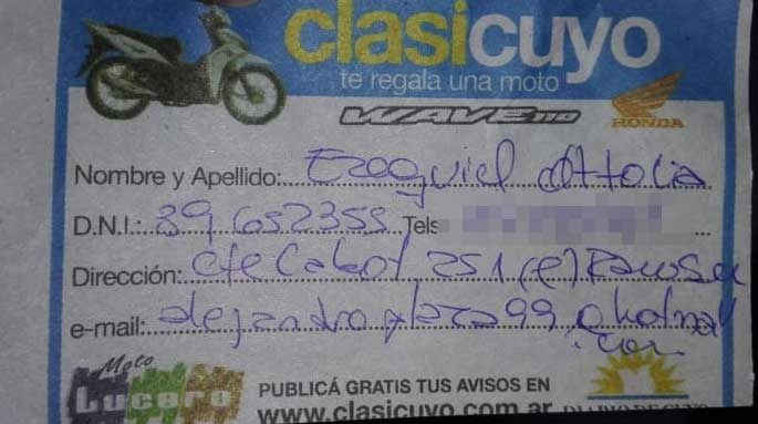 El ganador de la moto Honda 110cc fue Exequiel Otolia, DNI 39.652.355