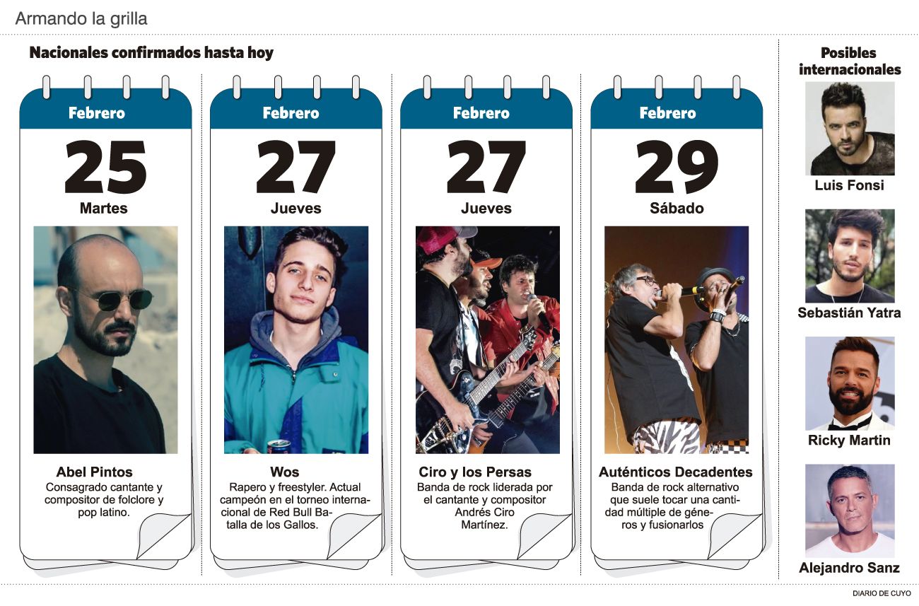 En ese escenario económico, la ministra de Turismo se concentró en artistas populares y muy convocantes y así confirmó el fin de semana que Abel Pintos abrirá los shows, el martes 25 de febrero. Una fuente del sector empresario aseguró a este diario que esperan traer esa misma noche otro número folclórico que podría estar entre Los Manseros Santiagueños o Peteco Carabajal, por ejemplo. El miércoles 26 aún es un misterio, ya que ninguna de las fuentes consultadas supieron responder qué pasará ese día. El jueves 27 ya están confirmados Ciro y Los Persas y Wos. En el Gobierno se ilusionan con que ambos repetirán la actuación en el Festival Mastai de Buenos Aires, donde a pesar de venir de palos musicales distintos (rock y rap respectivamente), se animaron a cantar juntos y fueron noticia nacional por ello. En ese recital fue Ciro quien convocó al rapero, que finalmente subió e interpretó junto al ex Los Piojos el clásico "Pistolas".