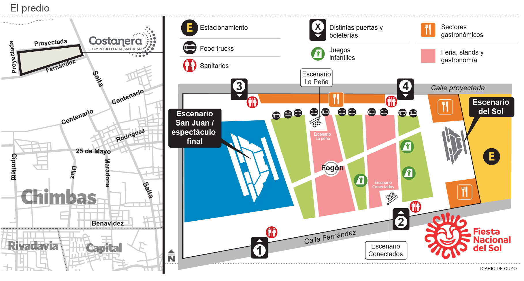 Este año, recorrer la Feria en el Predio Ferial Costanera, en Chimbas, será más práctico y sin tantos obstáculos, o al menos eso planean las autoridades. Si bien se mantendrán las áreas destinadas a los sectores de instituciones gubernamentales, de stands comerciales, de gastronomía, de municipios, de provincias invitadas, de shows y atracciones, todo fue reorganizado para liberar espacios comunes y ampliar otros. Uno de los principales cambios fue la reubicación y ampliación del sector gastronómico. "Hemos sacado todos los puestos gastronómicos de la zona central del predio, reubicándolos en los extremos del Predio. La gran mayoría se ubicará sobre el costado norte, tanto los puestos fijos de comida como los food trucks. A esto se sumarán los puestos que este año se instalarán en el sector este, a ambos costados del Escenario del Sol que esta vez también cambiará de ubicación. Allí la gente podrá disfrutar de la gastronomía mientras presencia los espectáculos. Con estos cambios, buscamos una mayor fluidez y dinamismo en la circulación", sostuvo Grynszpan.
