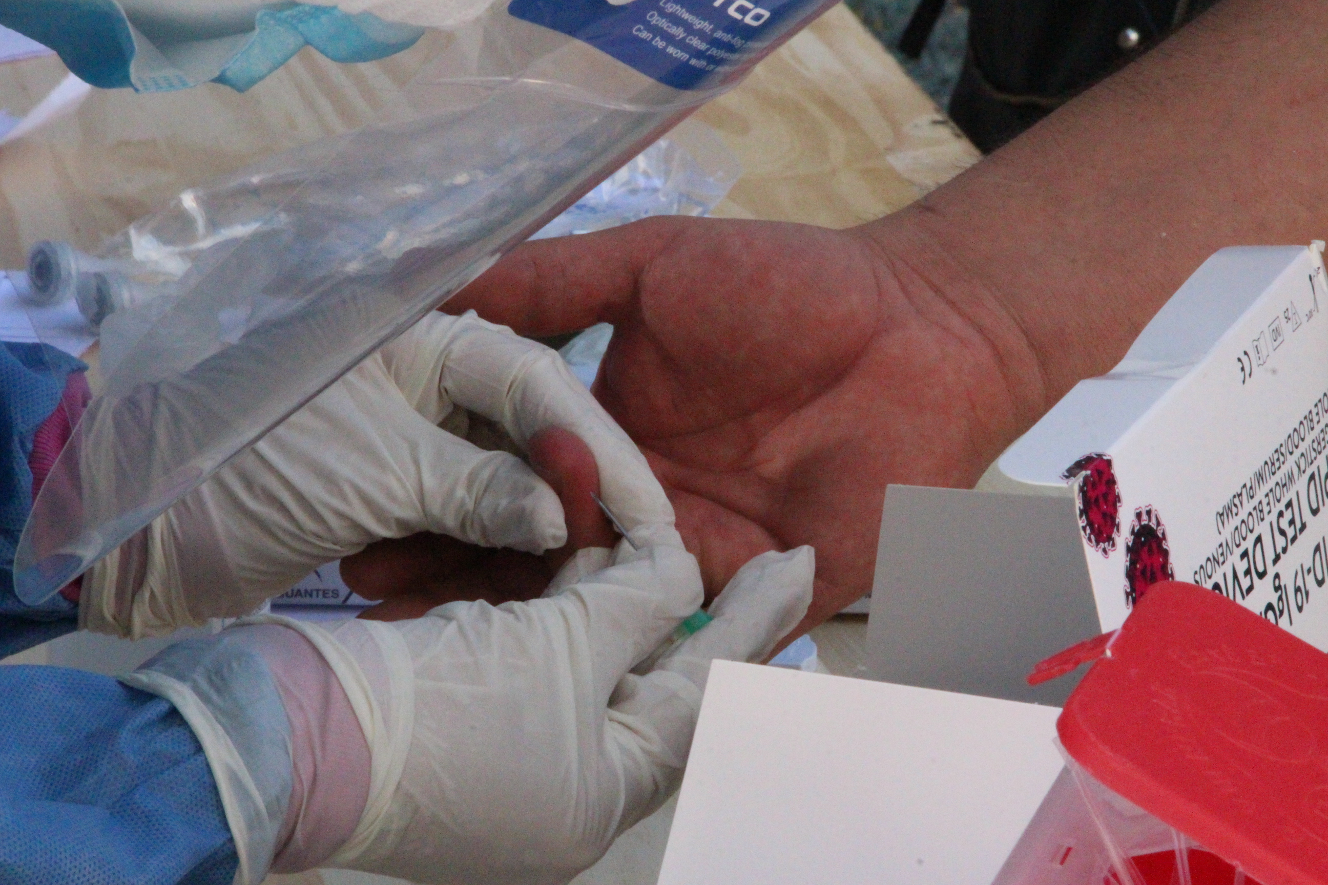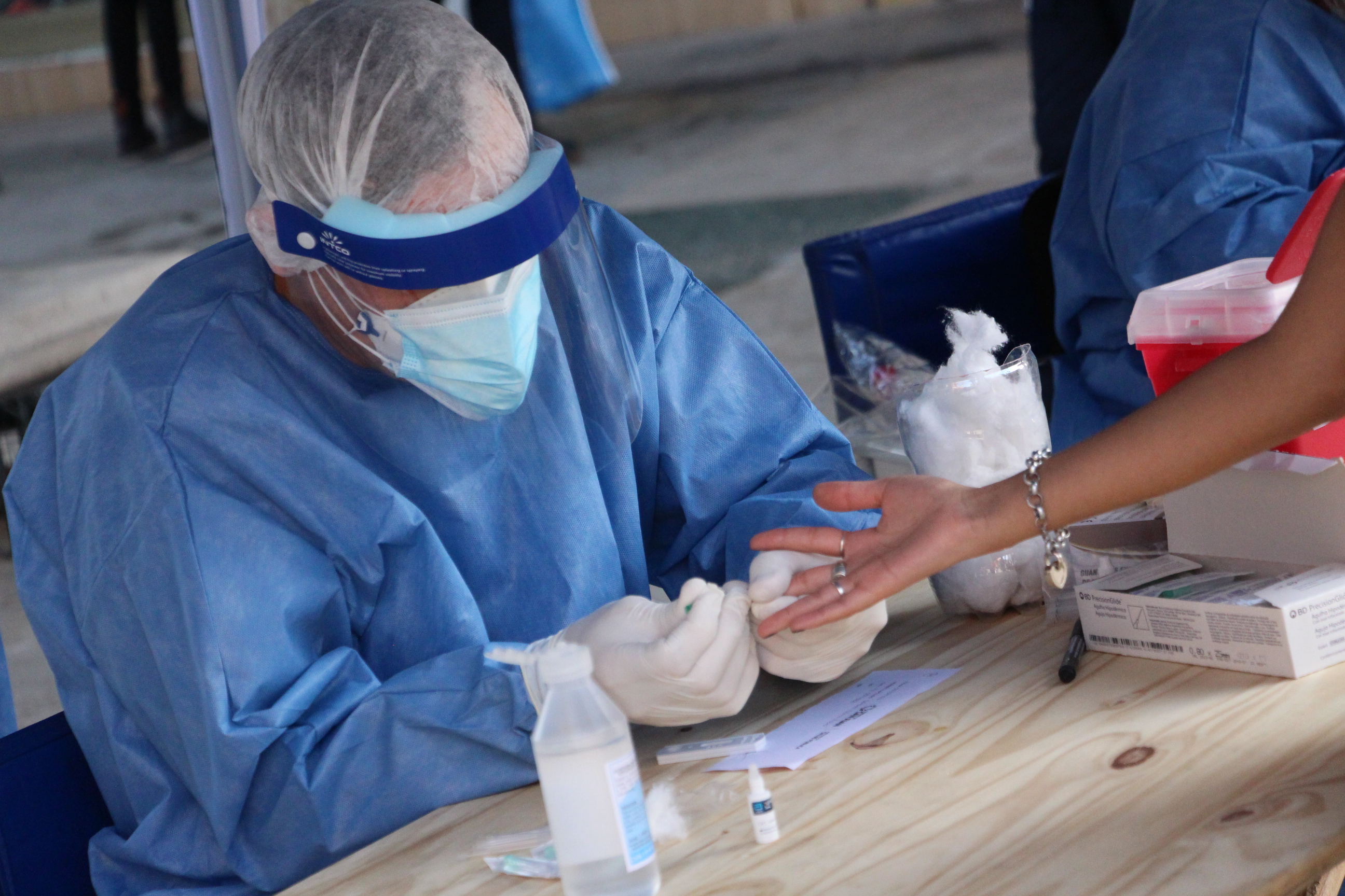 Al cabo de otra fila, personal de Salud procede a la extracción de sangre. Para eso pinchan un dedo de una mano y extraen una muestra.