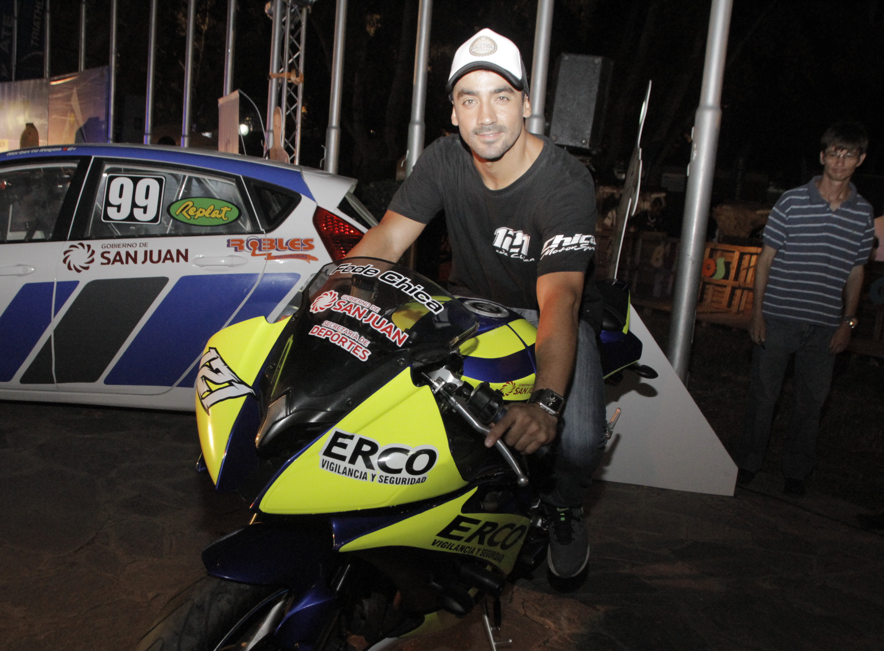 El stand de la Secretaría de Deportes expuso motos y autos de competición. Federico Chica, uno de los pilotos sanjuaninos, fue consultado por muchos curiosos.
