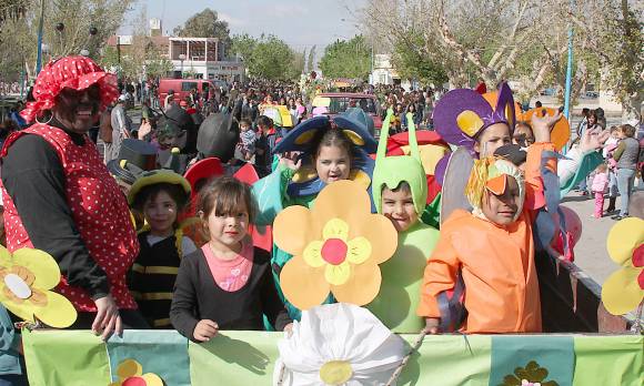 Cuando los aplausos de los familiares, que se habían ubicado a la orilla de la calle, y una bomba de estruendo anunciaron el inicio del desfile, todos ocuparon su lugar. Camionetas, tractores y hasta un caballo adornado con flores tiraban los carros que llevaban a los niños y sus maestras que, en algunos casos, también se animaron a disfrazarse.