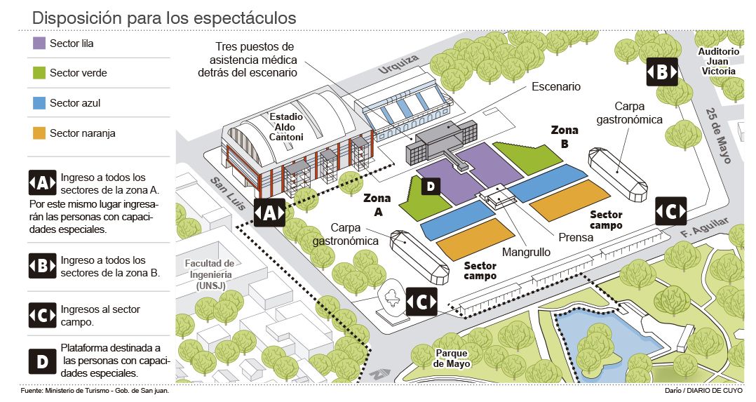 Como todos los años, el escenario estará ubicado en el sector Oeste del predio y tendrá varios ingresos (ver infografía).