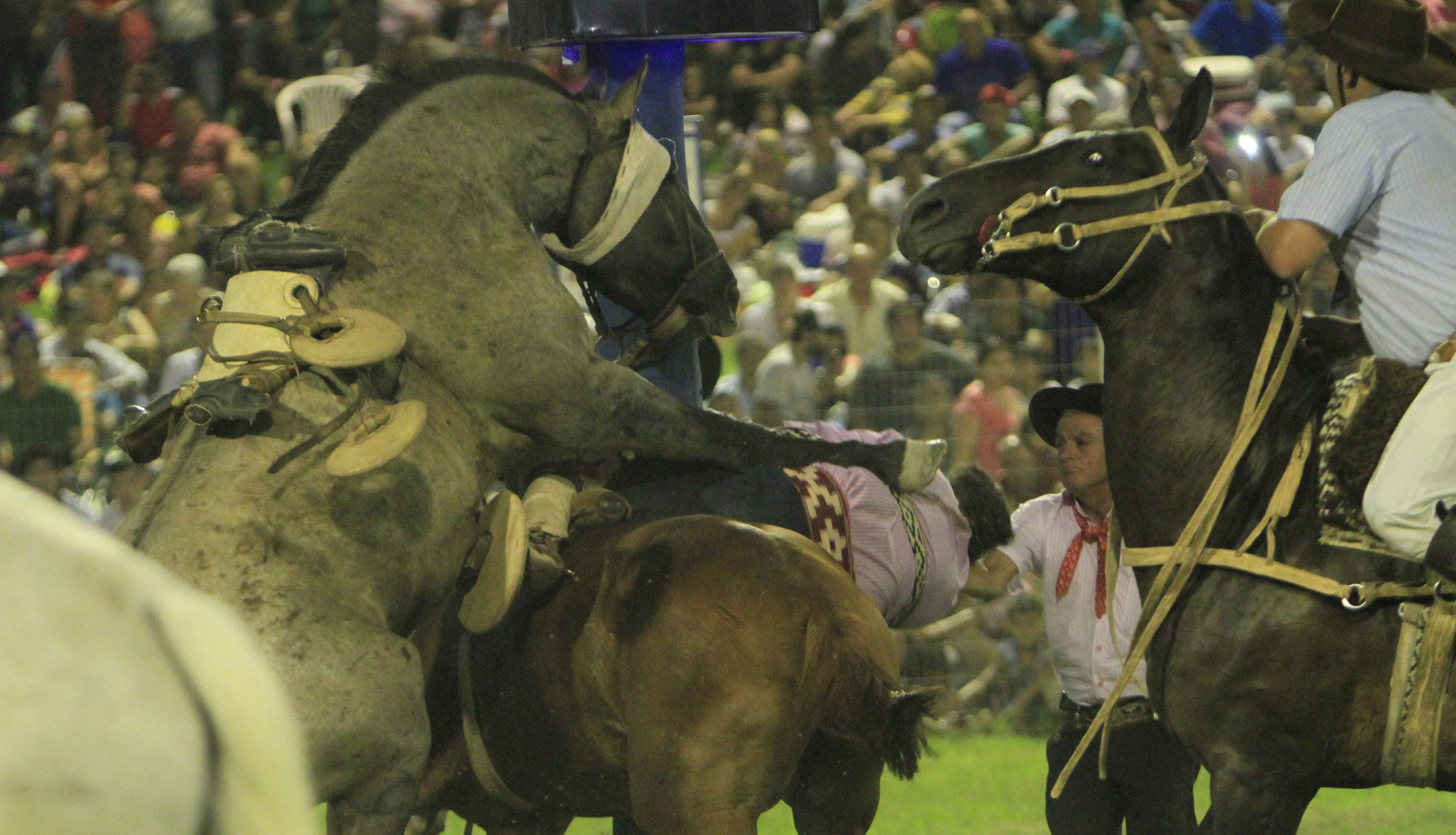 El desfile de las agrupaciones gauchas de la provincia arrancó cerca de las 22. Como todos los años, la patrona de Médano de Oro que también protege siempre a los jinetes fue la encargada de romper el hielo. Su entrada dejó a todos sorprendidos. “Nosotros nos ofrecimos a llevar la virgen, por eso no entró en carro como siempre. Somos Misioneros de Nuestra Señora de la Fuente y este año quisimos ser parte de la fiesta junto a ella”, dijo Lucas Pozo, uno de los chicos que fue el encargado de entronizarla en el escenario, desde donde llevó tranquilidad tras cada accidente en las jineteadas.