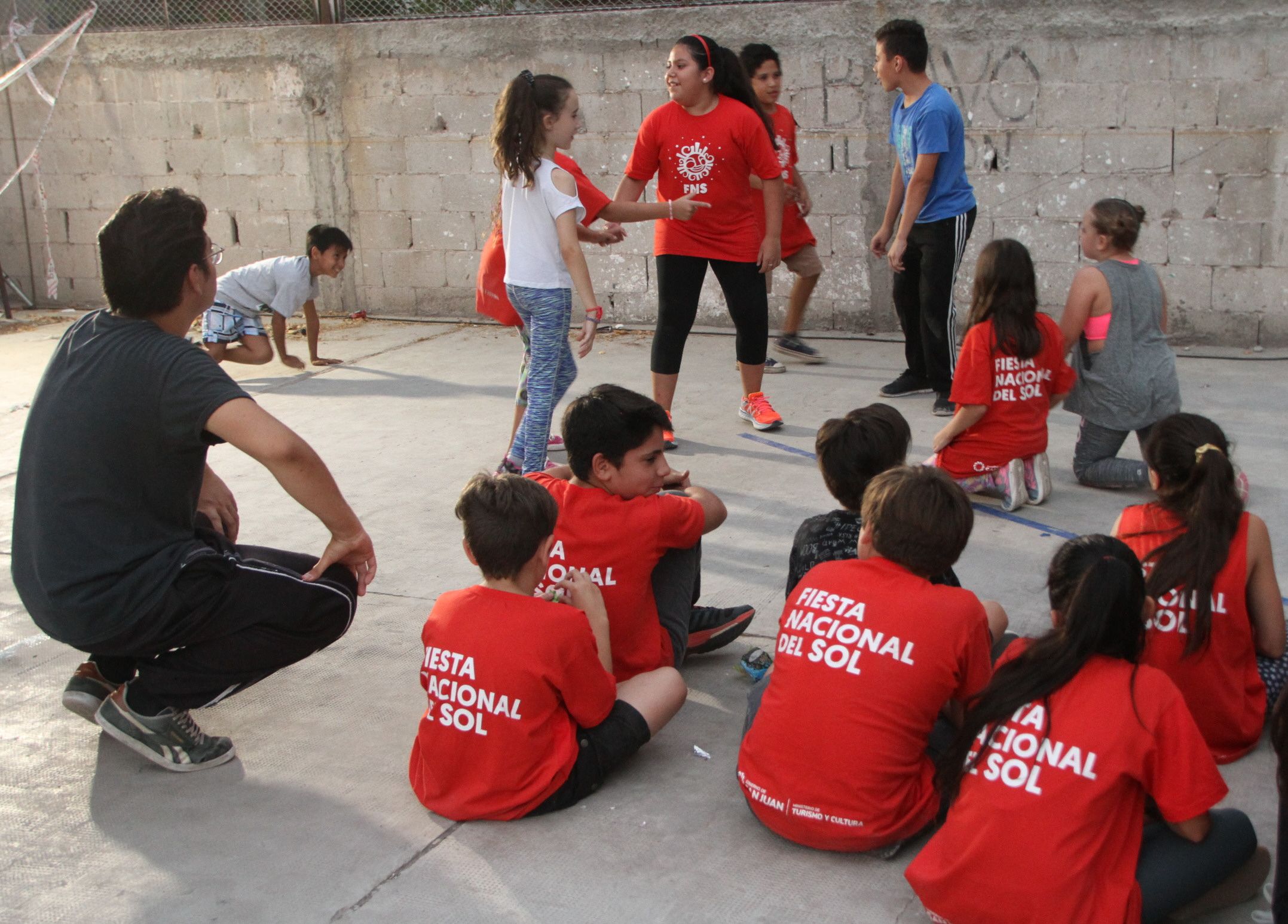 Al entrar al polideportivo de la escuela Normal Sarmiento los gritos y la alegría de los niños se percibe. Vestidos con remeras rojas de la Fiesta Nacional del Sol juegan como si estuvieran en el medio de un recreo escolar. En los jardines, los papás toman mate, conversan y hasta tejen mientras ven a sus pequeños artistas. Desde la producción de la Fiesta del Sol dijeron que todos los jueves y viernes el ensayo se vive con mucha más alegría que el resto de los días, pues los chicos le ponen un plus a esas jornadas laborales.