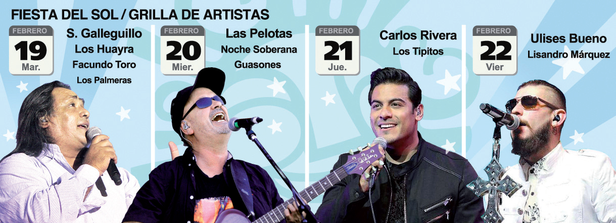 Por su parte, el Escenario del Sol, que también tendrá una capacidad aproximada de 20 mil personas, también tendrá buenos espectáculos. Subirán a escena Los Palmeras (el martes 19); la Noche Soberana (el miércoles 20), Los Tipitos (el jueves 21) y Lisandro Márquez y Ulises Bueno, el viernes 22 de febrero. "Los espectáculos se harán en simultáneo, porque son para públicos diferentes. Pero los del escenario mayor estarán terminando un poco más tarde", agregó Grynszpan quien dijo que aún no definen los precios de las entradas.