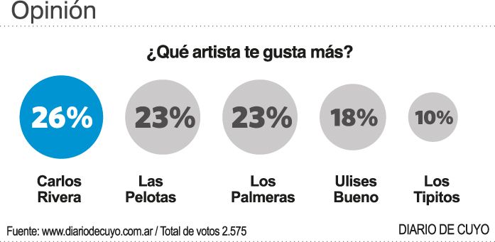 Después de que el Ministerio de Turismo confirmara la grilla de artistas, la web de DIARIO DE CUYO publicó una encuesta para que los lectores opinaran sobre qué músico era el que más les gustaba. Carlos Rivera, Las Pelotas y Los Palmeras fueron los que tuvieron mayor aceptación por los lectores de este medio (ver resultados en la infografía).
