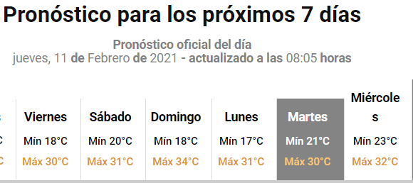 Para el día sábado se espera una temperatura máxima de 31 grados con viento del sector Este y probabilidad de chaparrones por la mañana y tormentas aisladas en la tarde-noche.