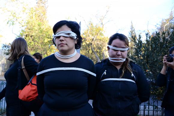 Dos chicas posaron frente a la iglesia de Santo Domingo con vestimenta larga y de color negro, atadas con una soga, en clara referencia a lo que es la trata de personas, donde las víctimas están obligadas a callar el calvario que padecen.