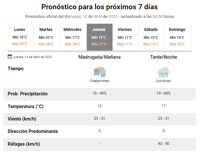 Ya el jueves, el cambio en la temperatura será más notable. Con la probabilidad de lluvias aún vigente, la temperatura mínima será de 12 grados y la máxima llegará sólo a los 17 grados. En tanto que, por la noche, nuevamente se sentirá el viento Sur.