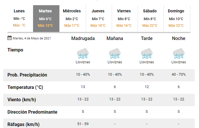 La jornada se presentará con cielo completamente cubierto y lloviznas. Además, durante la madrugada habrá ráfagas con velocidades entre 51 y 59 km/h y durante todo el día predominará viento del Sur.