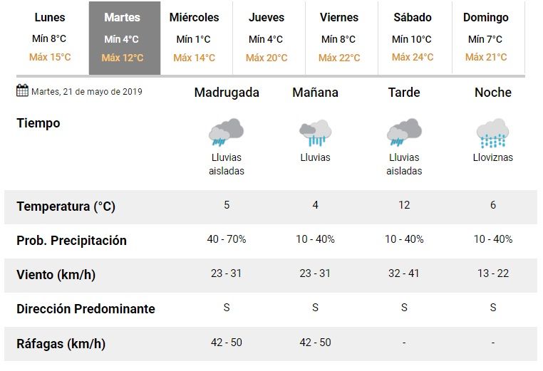 La jornada arrancará con una alta probabilidad de lluvias y ráfagas del Sur, lo que motivará una helada.