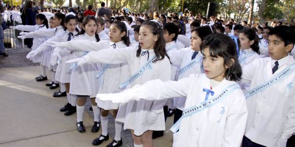 Con guardapolvos impecables, zapatos lustrosos y vistiendo una banda albiceleste que decía "Promesa de lealtad 2010", los chicos comenzaron a ubicarse en el centro de la plaza. Por los nervios y el frío frotaron sus manos en forma permanente y se movieron al ritmo de la música folclórica que sonaba de fondo. De vez en cuando también estiraron el brazo derecho hacia delante, ensayando el movimiento con el que iban a prometer lealtad a la Bandera, ante el aplauso emocionado de los padres. Querían que todo saliera perfecto, ya que fueron los primeros alumnos de 4to grado del Gran San Juan en hacer esta promesa mediante un acto público y afuera de los edificios escolares.
