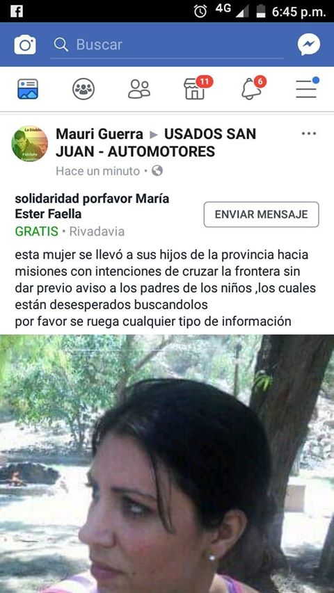 "Esta mujer se llevó a sus hijos a Misiones con intenciones de cruzar la frontera sin dar previo aviso a los padres de los niños, los cuales están desesperados buscándolos", escribió su ex en diferentes grupos de compra y venta de Facebook.