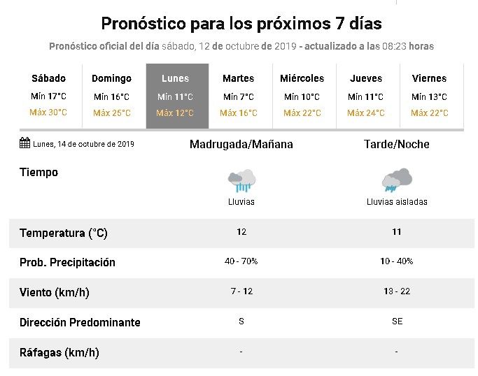 De acuerdo a la institución nacional, San Juan tendrá un drástico descenso de la temperatura. La barra mercurial señalará máximas de 12 y 16 grados para el lunes y martes, respectivamente. A lo que se suma una alta probabilidad de precipitaciones para el lunes: 70%, y vientos del sector Sur y Sureste a razón de 12 km/h. El martes todo se tornará un poco más benevolente en cuanto al frío.