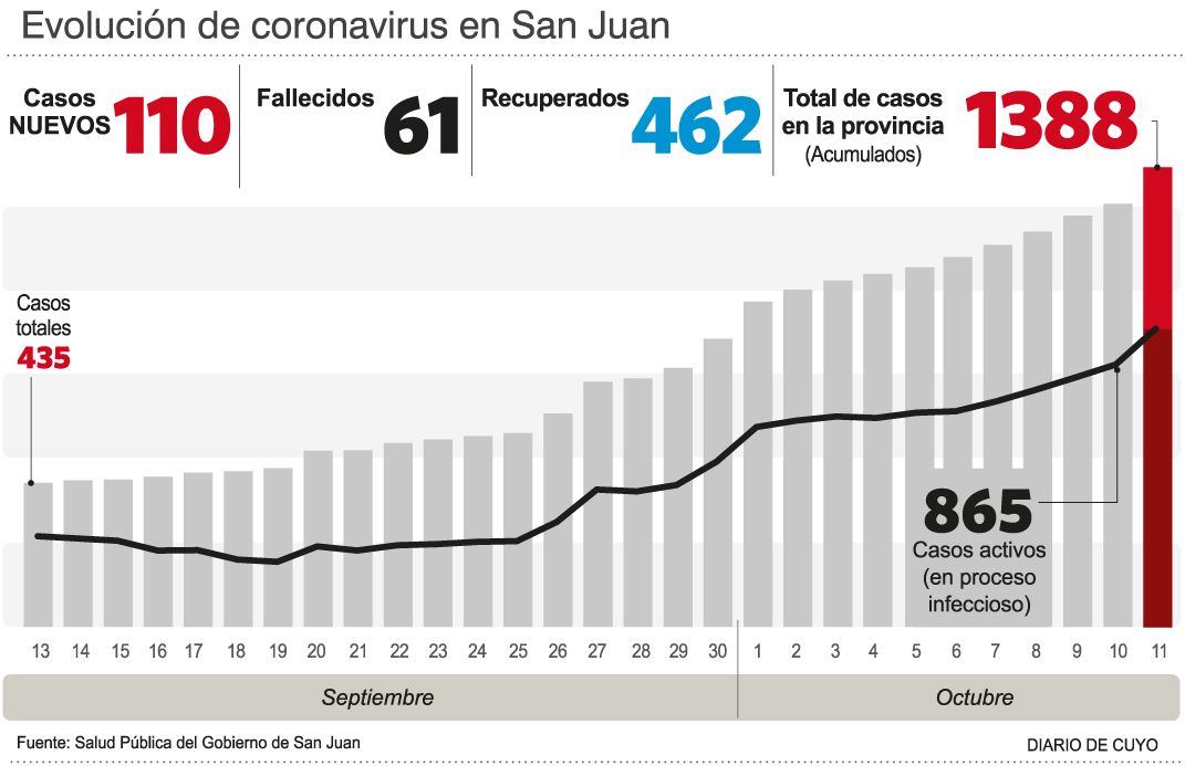 Desde Salud Pública difundieron la cantidad de los 110 nuevos casos positivos en San Juan, pero sin dar detalles sobre el departamento al que pertenecen esas personas. De todos modos, el número basta para encender la alarma porque representa un gran salto en la cantidad de contagios. El viernes pasado fue el día donde se registró la mayor cantidad de casos con 49, menos de la mitad de los registrados ayer.